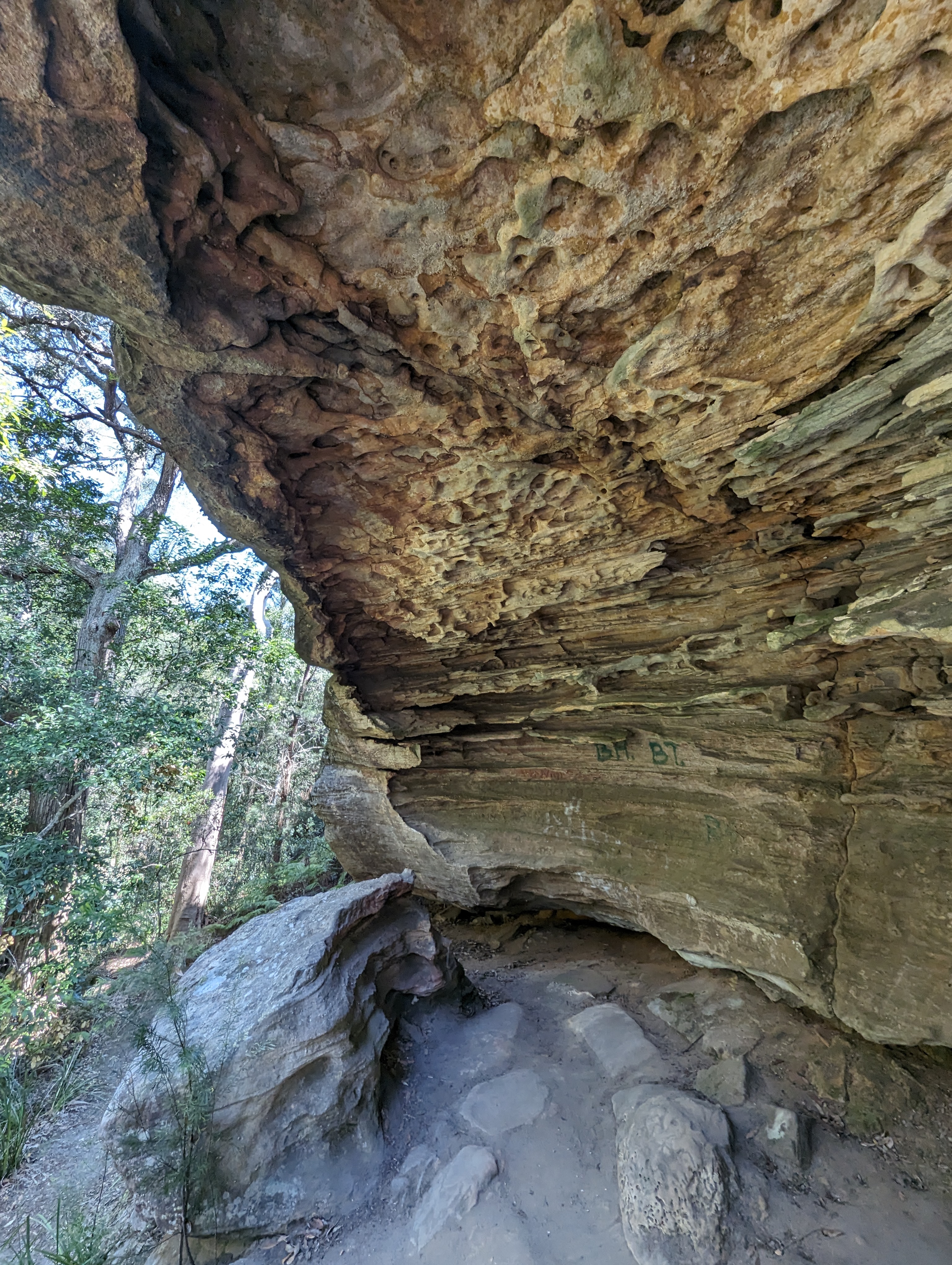 | The Great North Walk track passes around some interesting overhanging rocks |
